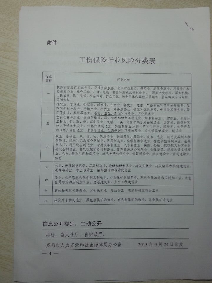 為進一步貫徹落實《社會保險法》和《工傷保險條例》,健全適應我市經濟社會發展需要的工傷保險費率政策,切實提高工傷保險基金使用效率,根據人力資源社會保障部、財政部《關于調整工傷保險費率政策的通知》(人社部發201571號)、《關于做好工傷保險費率調整工作進一步加強基金管理的指導意見》(人社部發201572號)和省人力資源社會保障廳、省財政廳關于《轉發人力資源社會保障部、財政部關于調整工傷保險費率政策的通知的通知》(川人社辦發2015118號)精神,經研究并報市政府批準,現就調整成都市工傷保險費率政策有關事項通知如下: